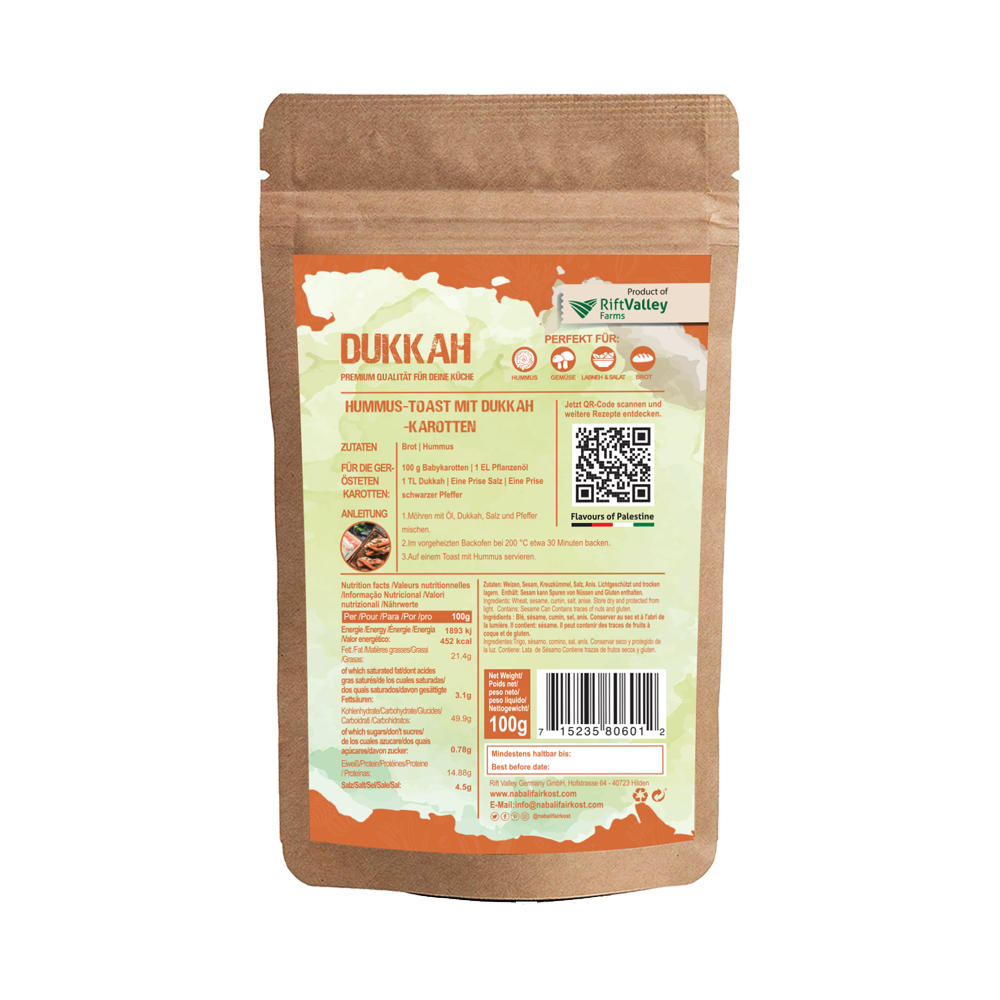 Dukkah ist eine palästinensische Gewürzmischung aus erlesenem Kreuzkümmel, Anis, geröstetem Sesam und Weizen. Durch die perfekte Abstimmung der Gewürze entsteht eine einzigartige Komposition, welche genial vielfältig ist und auf wundersame Weise den Geschmack eines Gerichts intensivieren oder gar in eine andere Richtung lenken kann.